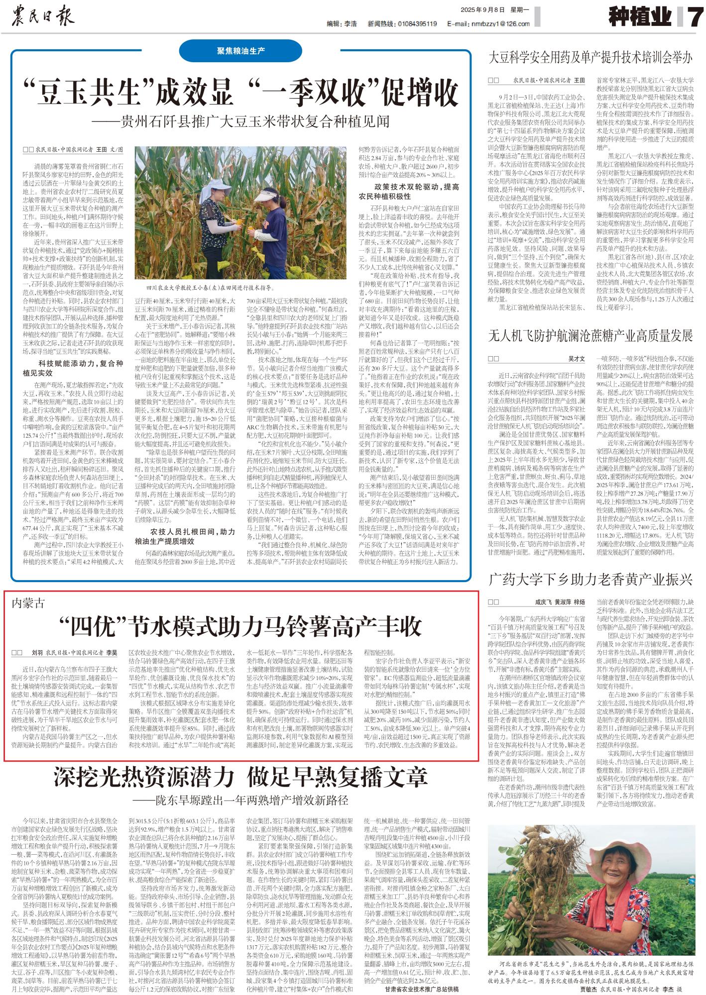 2025年9月8日,《農(nóng)民日報》第7版整版刊發(fā)題為《內(nèi)蒙古“四優(yōu)”節(jié)水模式助力馬鈴薯高產(chǎn)豐收》的文章,報道了在內(nèi)蒙古烏蘭察布市四子王旗大黑河鄉(xiāng)宏宇合作社的示范田里,隨著最后一批土壤墑情傳感器安裝調(diào)試完成,一套集智能感知、精準灌溉和遠程控制于一體的“四優(yōu)”節(jié)水系統(tǒng)正式投入運行。這標志著內(nèi)蒙古在馬鈴薯節(jié)水增產(chǎn)關(guān)鍵技術(shù)方面取得突破性進展,為干旱半干旱地區(qū)農(nóng)業(yè)節(jié)水與可持續(xù)發(fā)展樹立了新樣板。