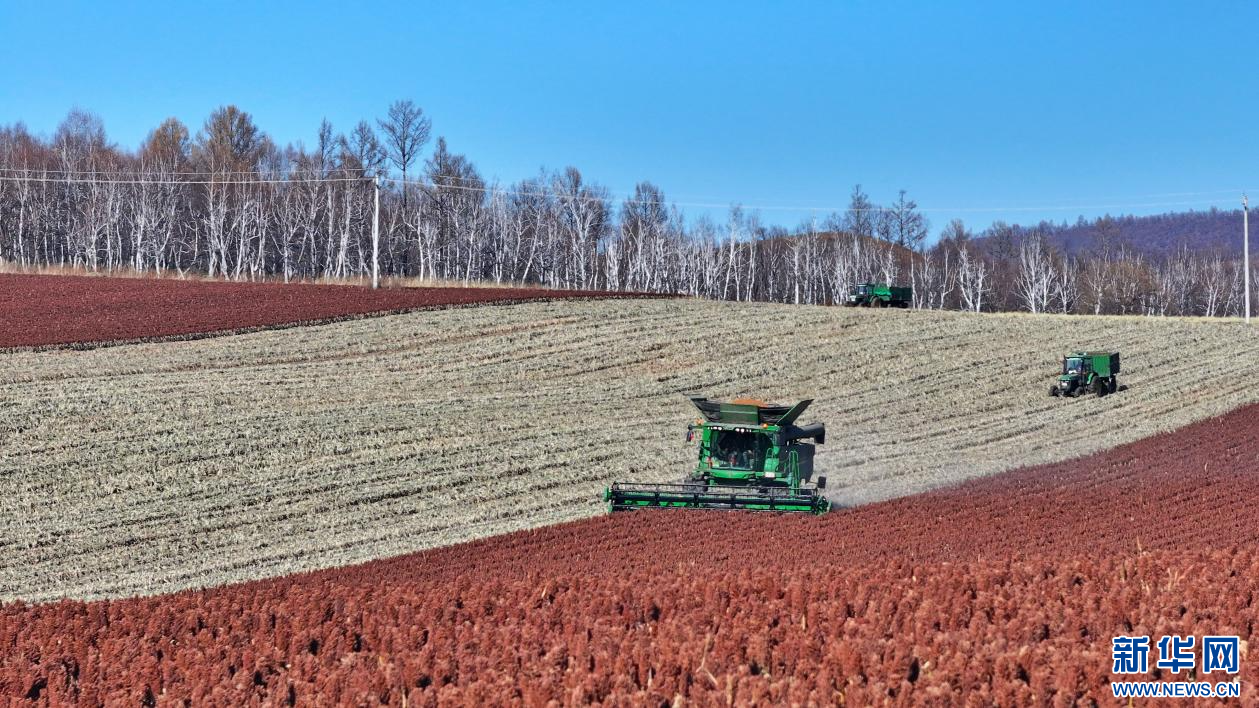 ??10月22日,在內蒙古自治區(qū)呼倫貝爾農墾綽爾河農牧場有限公司田間,農場員工正在收獲高粱。新華網發(fā)(哈園碩 攝)