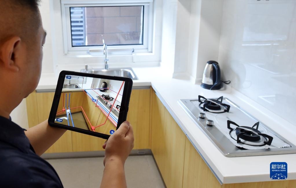 在中新天津生態(tài)城一小區(qū),小區(qū)業(yè)主通過(guò)AR房屋使用說(shuō)明書(shū)查看廚房管道線(xiàn)路(2020年8月13日攝)。新華社記者 趙子碩 攝